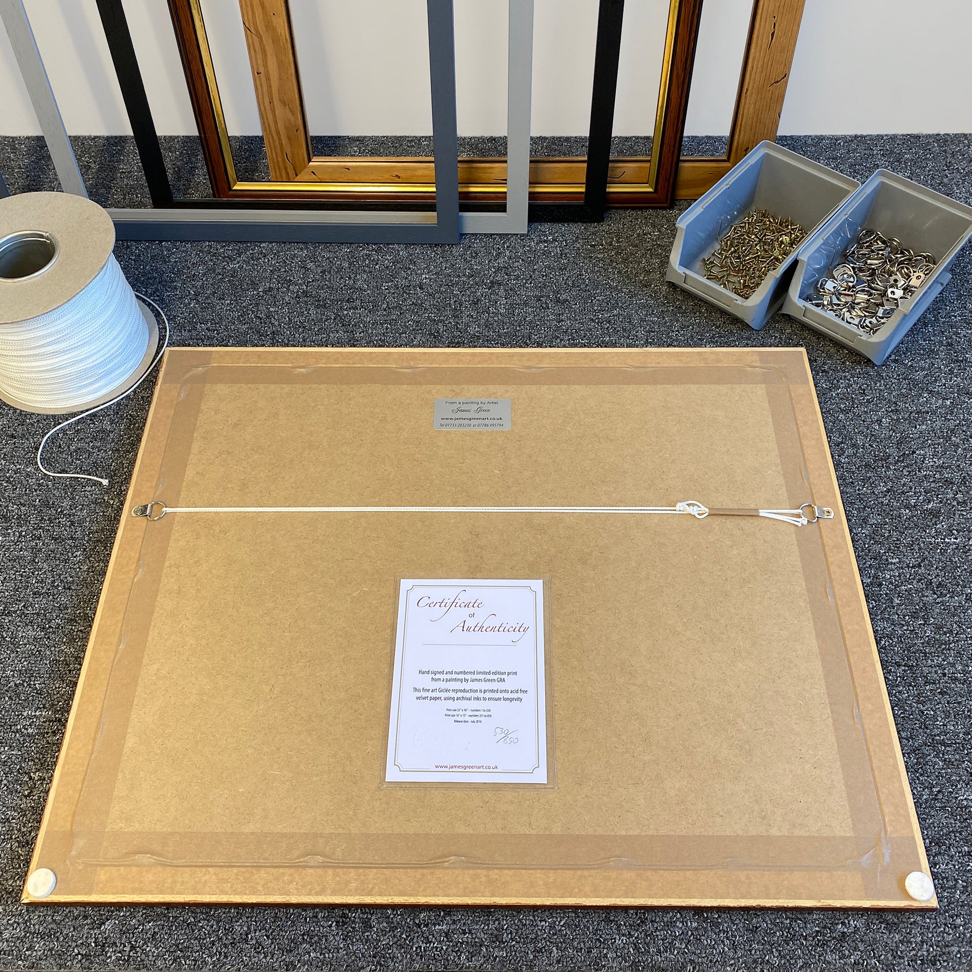 The picture will arrive beautifully presented with a double mount and hard MDF backing in a clear polly bag for a gift like appearance (not just rolled in a tube!)