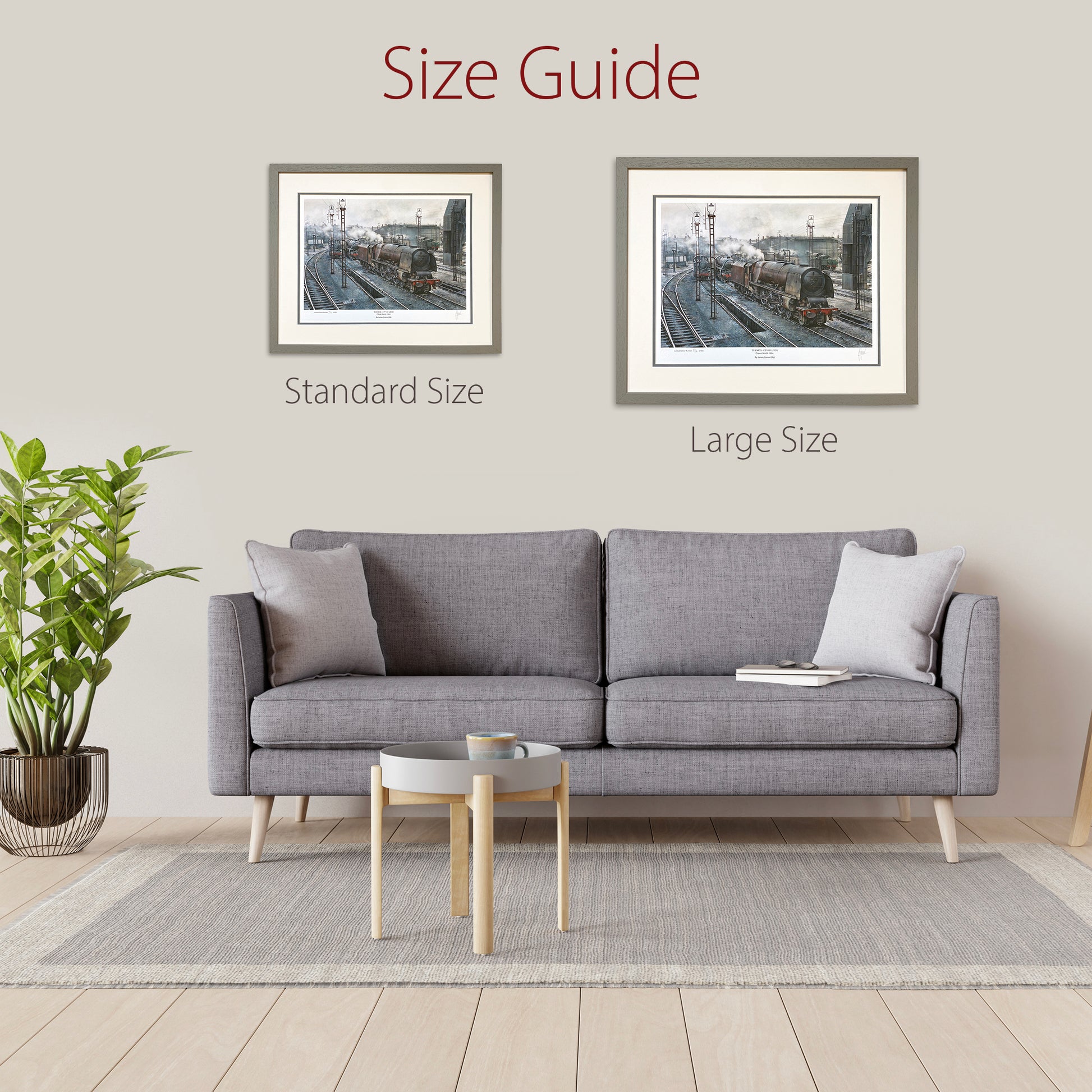Large size mounted prints have a overall measurement of 27"x21" with the print itself measuring 22"x16". Large size framed prints measure approximately 30"x24" depending on chosen moulding.