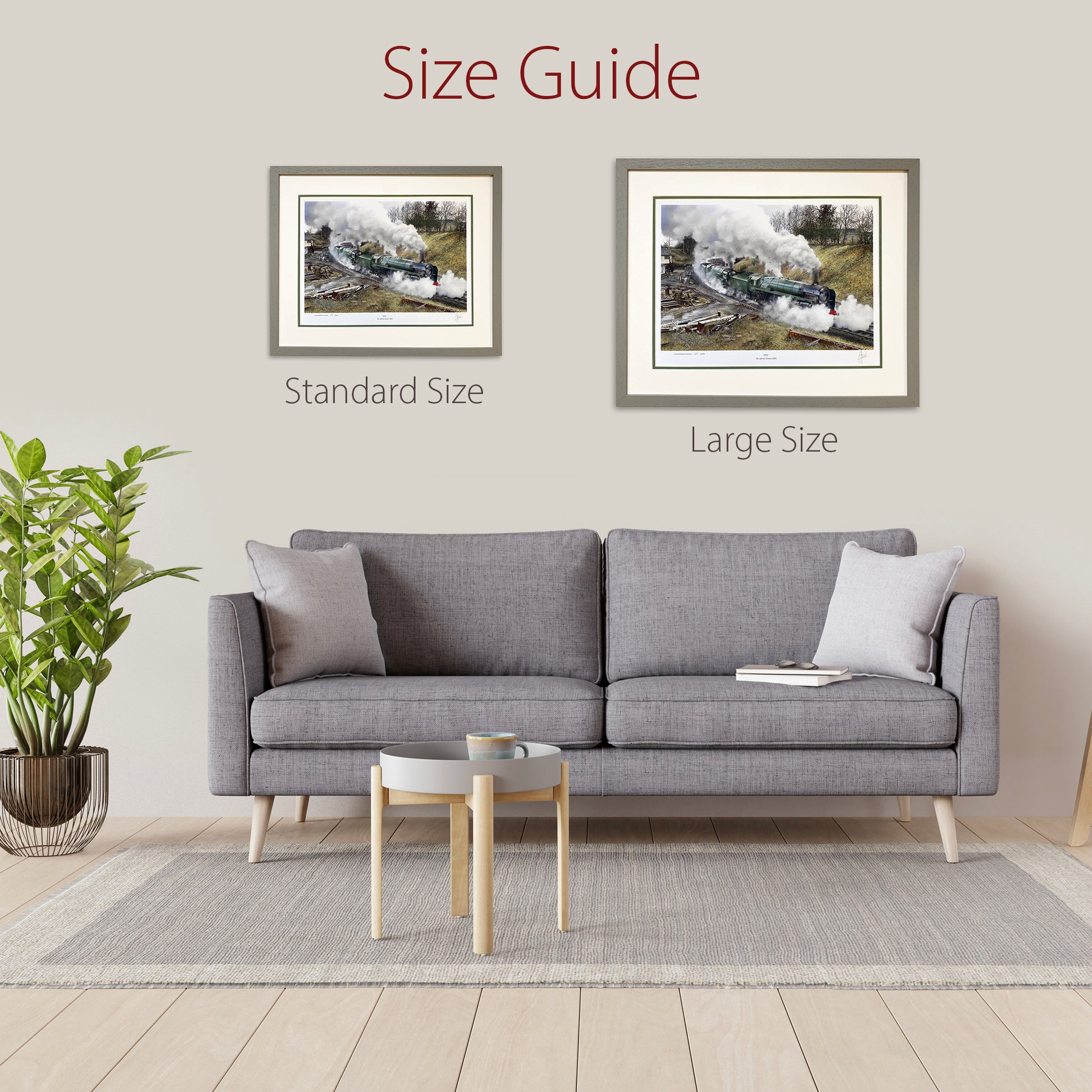 Large size mounted prints have a overall measurement of 27"x21" with the print itself measuring 22"x16". Large size framed prints measure approximately 30"x24" depending on chosen moulding.