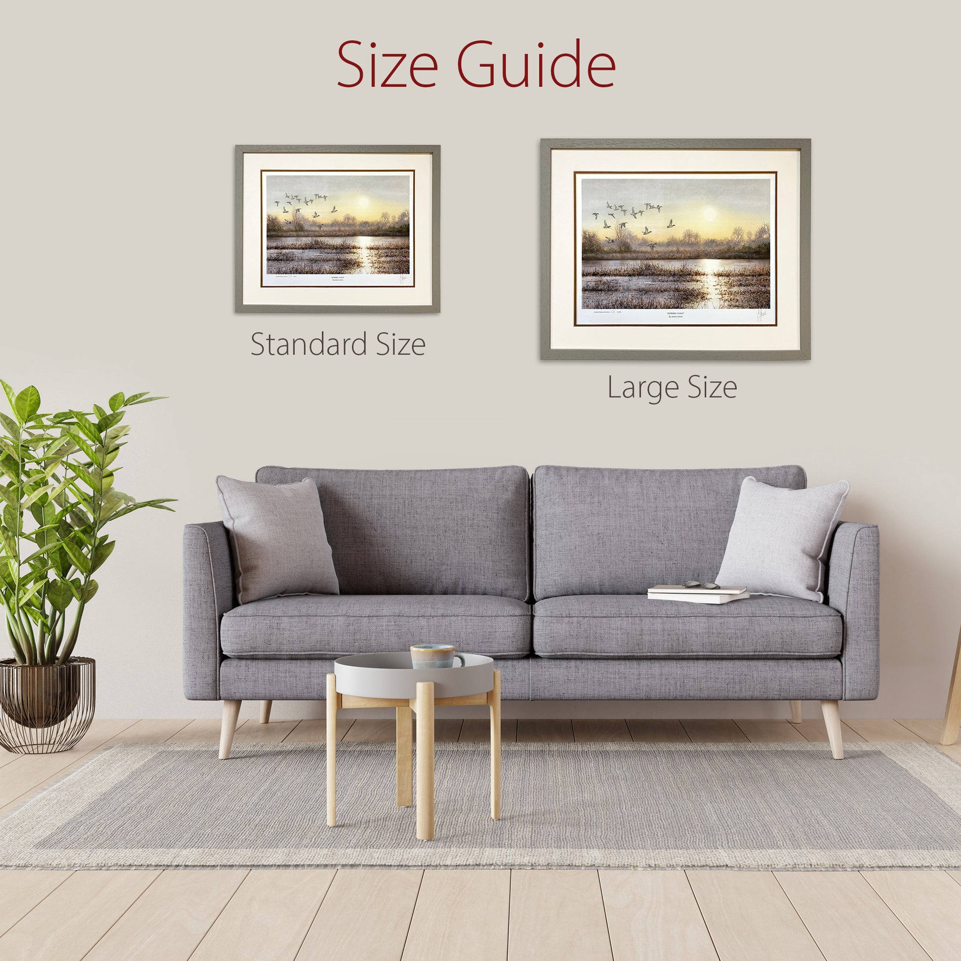 Large size mounted prints have a overall measurement of 27"x21" with the print itself measuring 22"x16". Large size framed prints measure approximately 30"x24" depending on chosen moulding.