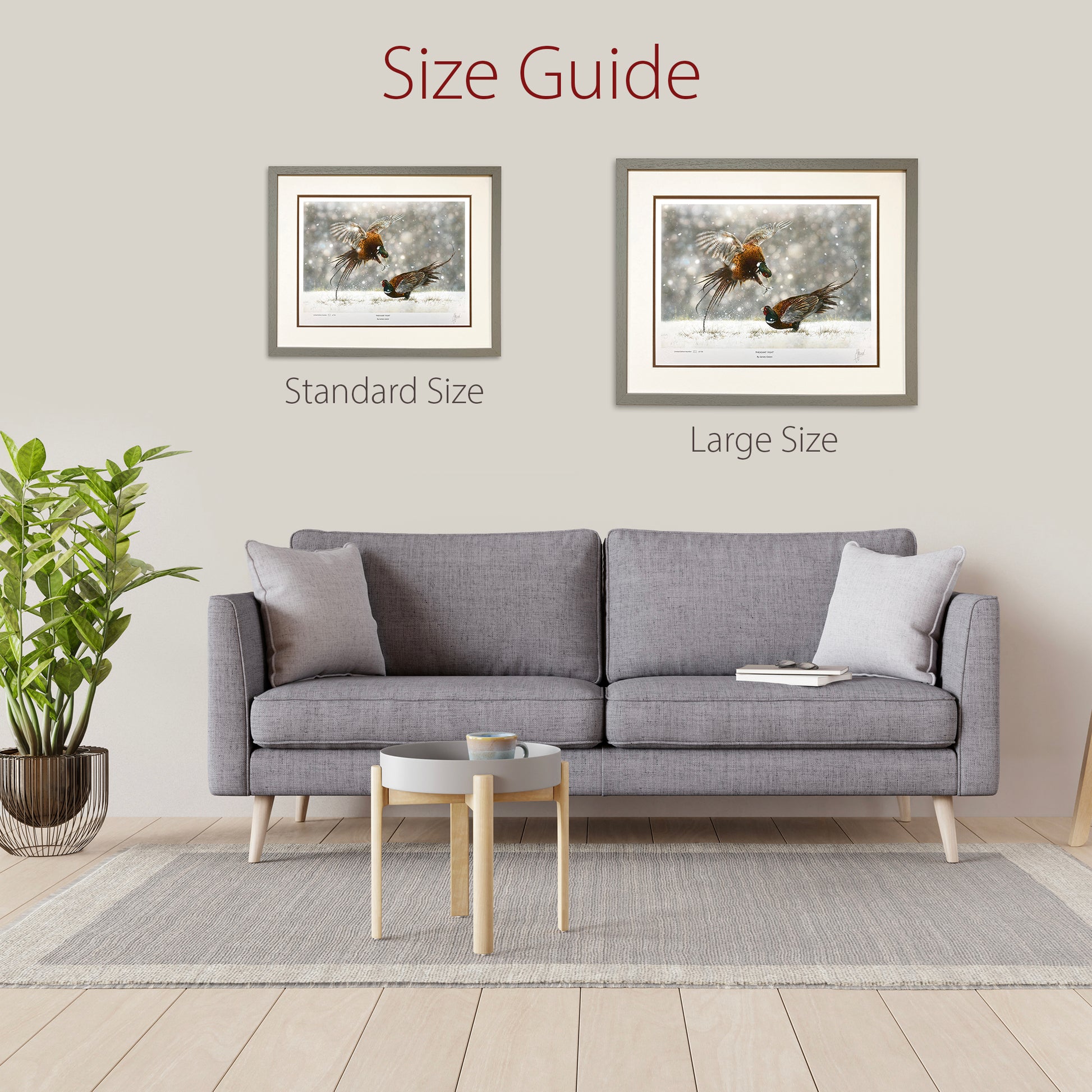 Standard size mounted prints have a overall measurement of 20"x16" with the print itself measuring 16"x12". Standard size framed prints measure approximately 22"x18" depending on chosen moulding.