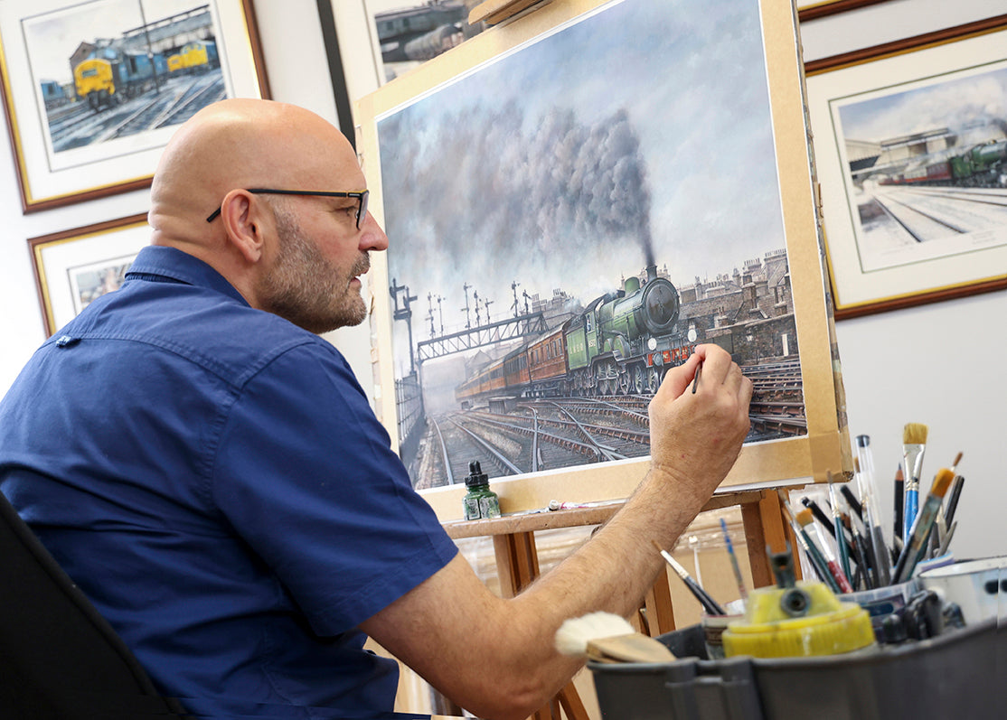 James Green is a renowned railway and landscape painter. He achieves his detailed works by mixing acrylic ink and watercolour, slowly layering the paint in such a way to give to his paintings a distinctive realistic look.