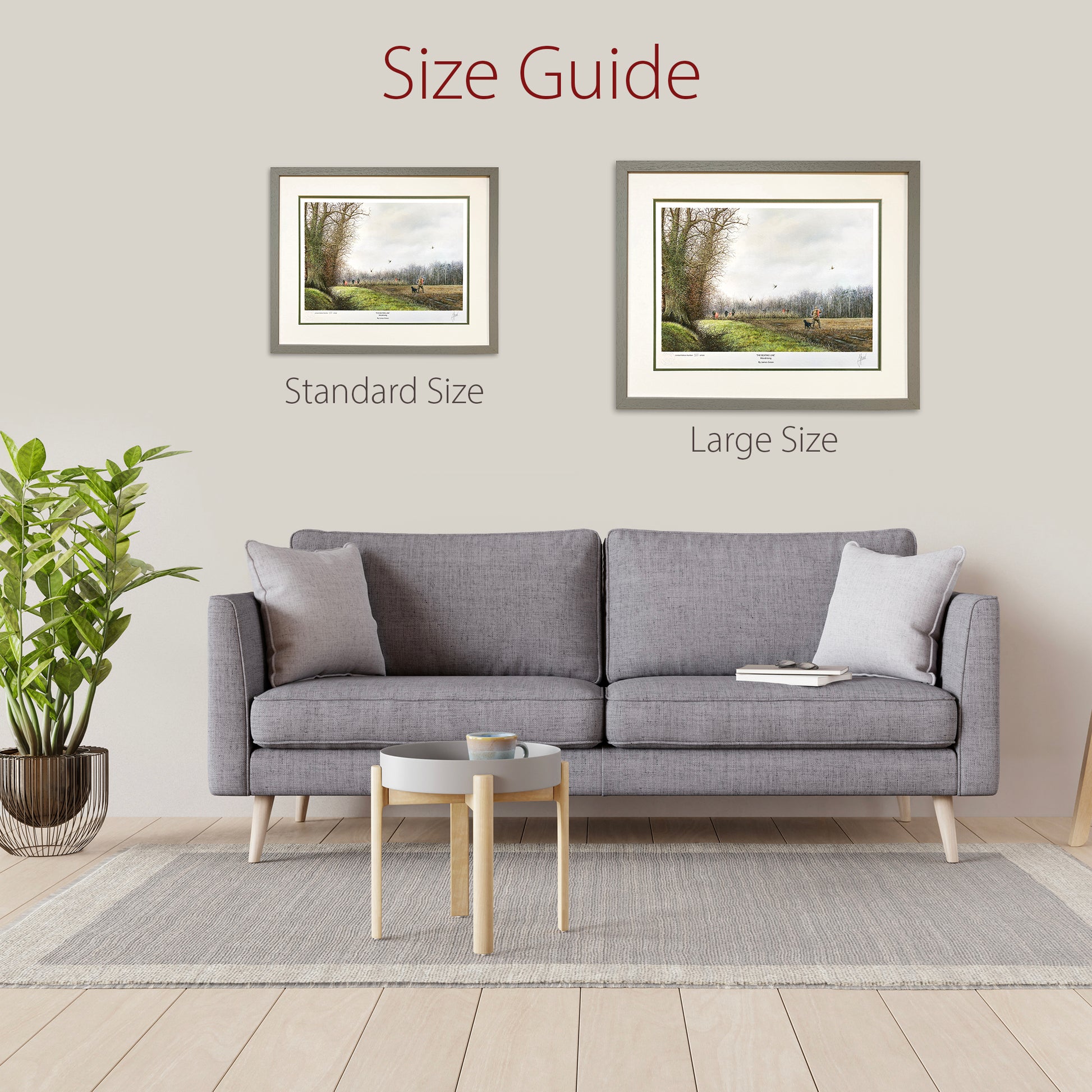 Large size mounted prints have a overall measurement of 27"x21" with the print itself measuring 22"x16". Large size framed prints measure approximately 30"x24" depending on chosen moulding.